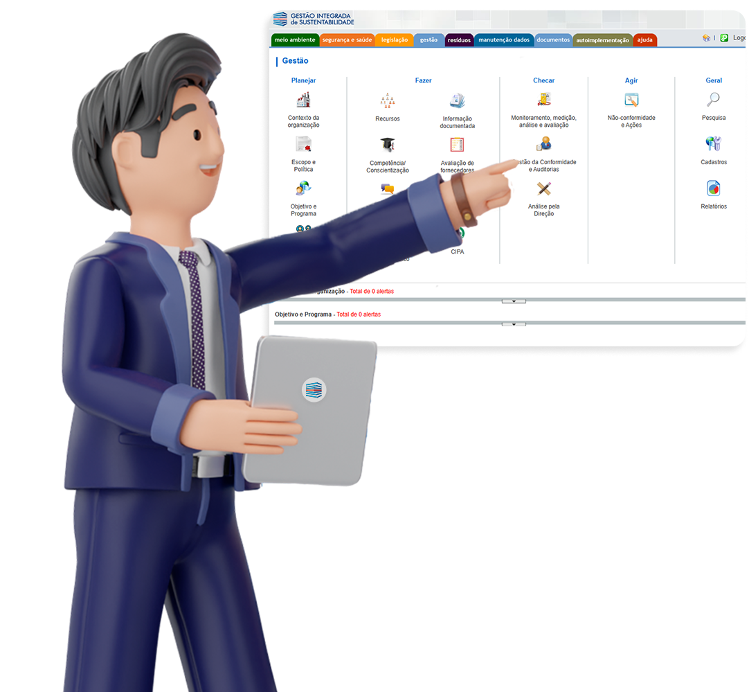 Programas; Plano de Monitoramento e Medição e KPI, Análise pela Direção; CIPA Digital, entre outras funcionalidades. Gestão integrada dos requisitos da ISO 14001 e ISO 45001.